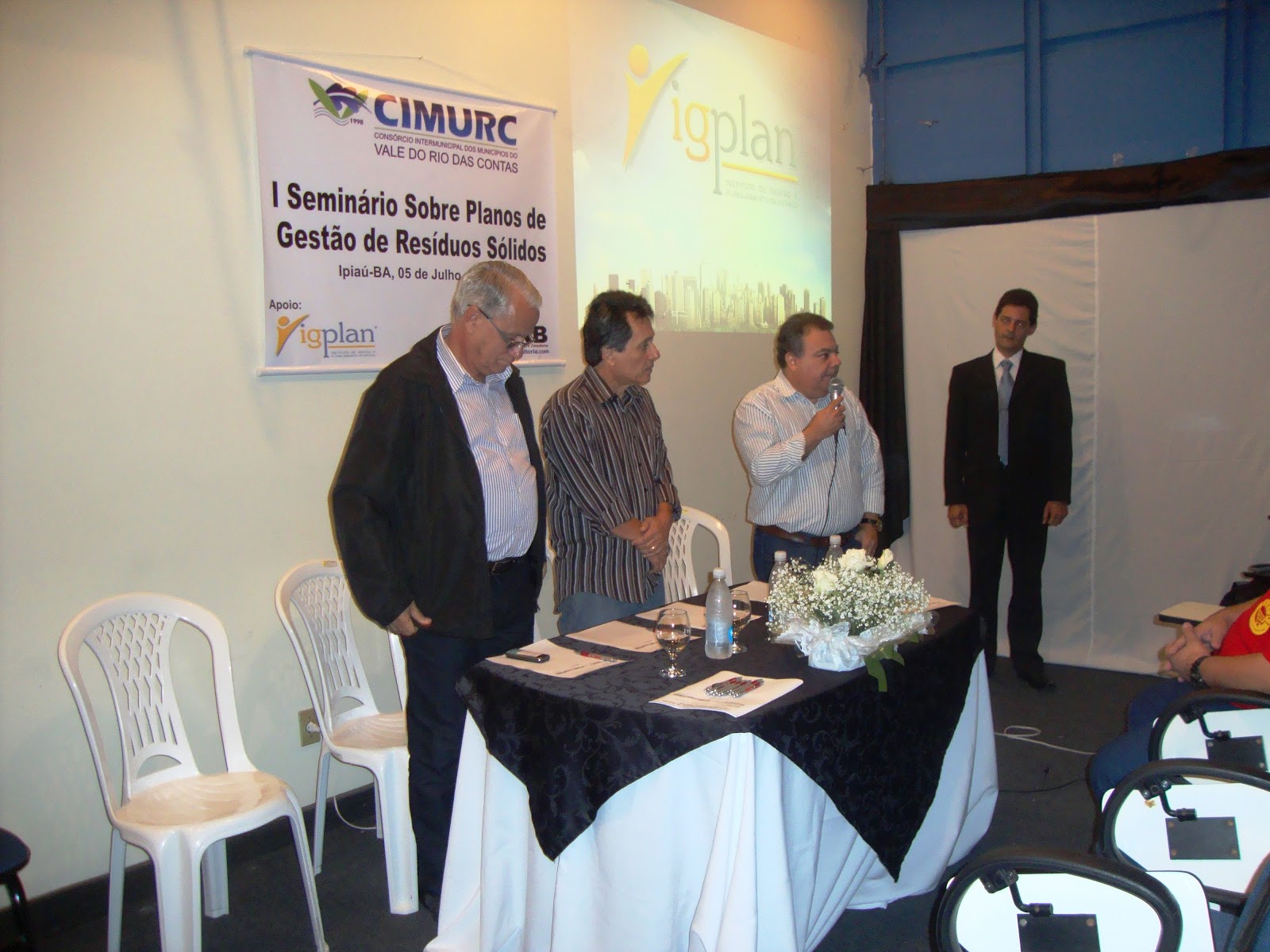 O evento foi aberto e dirigido pelos Prefeitos dos Municípios de Ipiaú Deraldino de Araújo e Gilson Fonseca de Itagibá, além da participação do Prefeito de Ibirataia Jorge Abdon Fair. As palestras ficaram a cargo da Coordenadora de Projetos Estratégicos da Companhia de Desenvolvimento Urbano do Estado da Bahia – CONDER, Drª. Ana Maria Vieira Oliveira, que representou na oportunidade a Superintendente de Resíduos Sólidos, Drª. Márcia Jurema de Magalhães Trocoli e Dr. Adalberto Costi, vice-presidente do Instituto de Gestão e Desenvolvimento do Estado – IGPLAN, cujos palestrantes discorreram sobre os seguintes temas: Sustentabilidade nos Sistemas de Gestão de Resíduos Sólidos e Os Planos de Gestão de Resíduos Sólidos à Luz da Lei 12.305/2010.